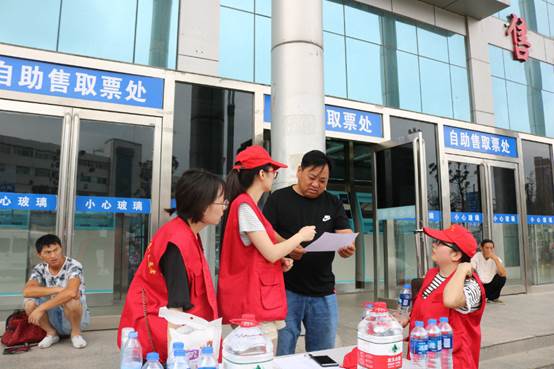 7月3日,像往常一样,团队成员早早地乘着公交车来到了商丘中心汽车站,向车站的工作人员借来了咨询台,摆好了矿泉水和问卷表,穿上了志愿者的红马甲,一天的志愿活动就这样开始了。