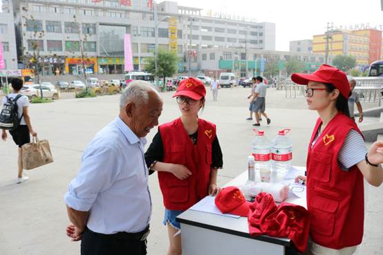 在路边,看到有许多的环卫工人正在辛苦的工作,志愿者们纷纷上前递上水和纸巾,并把他们扶到阴影处,替他们分担一些烈日。摆出咨询台没一会儿,就被围的水泄不通,有问路的外地乘客,有询问班次的一家三口,还有很多初次网上购票的乘客,志愿者们都详细且耐心的一一解答。
