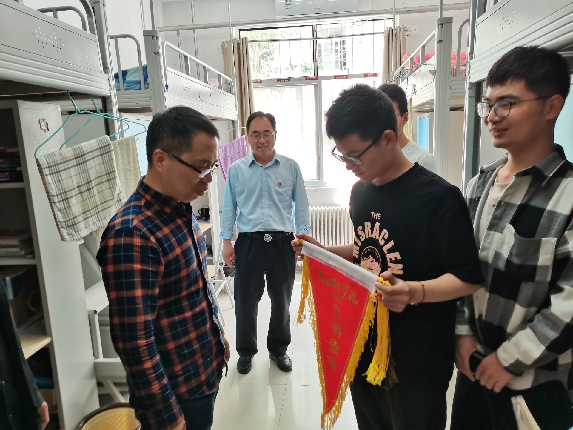 走访宿舍过程中,各位老师与同学们亲切交谈,从思想、学习、生活等不同方面了解员工的情况,并对同学们遇到的困难及时给出解答方法,代表公司表达了对同学们的关心与殷切希望。同时,各位老师为获得伟德国际1949官网“文明宿舍”荣誉称号的宿舍挂上锦旗,鼓励获得荣誉称号的宿舍继续保持良好的宿舍氛围,在学习、生活中充分发挥引领作用,带领同学们共同营造积极向上的文明校园。