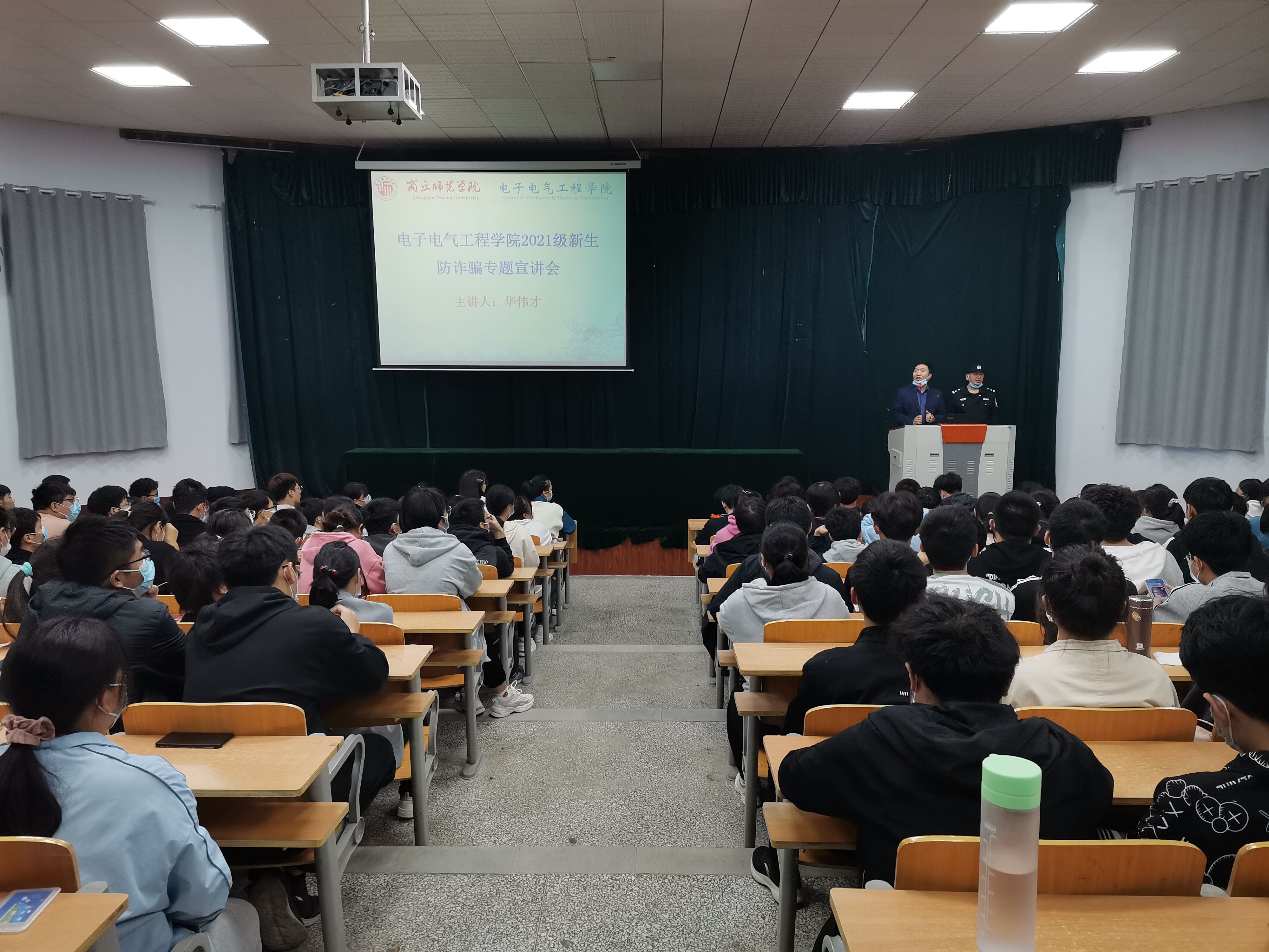 11月4日,伟德国际1949官网邀请文化路派出所华伟才警官,于睢阳校区为2021级新生做防诈骗专题宣讲会。公司党委副书记蒋玉涛,21级辅导员陈玉昊和全体新生340余人参加宣讲会。