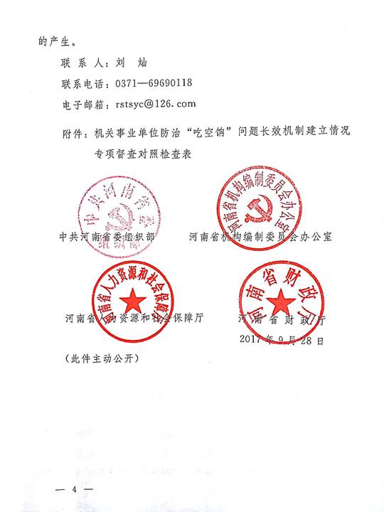 现将省委组织部、省编办、省人社厅、省财政厅《关于开展机关事业单位防治“吃空饷”问题长效机制建立情况专项督查工作的通知》(豫人社[2017]83号)转发你们,请按通知要求,开展全面自查。形成自查报告,纸质和电子版于10月12日下午17:00前报省教育厅,我厅汇总后统一报省人社厅。