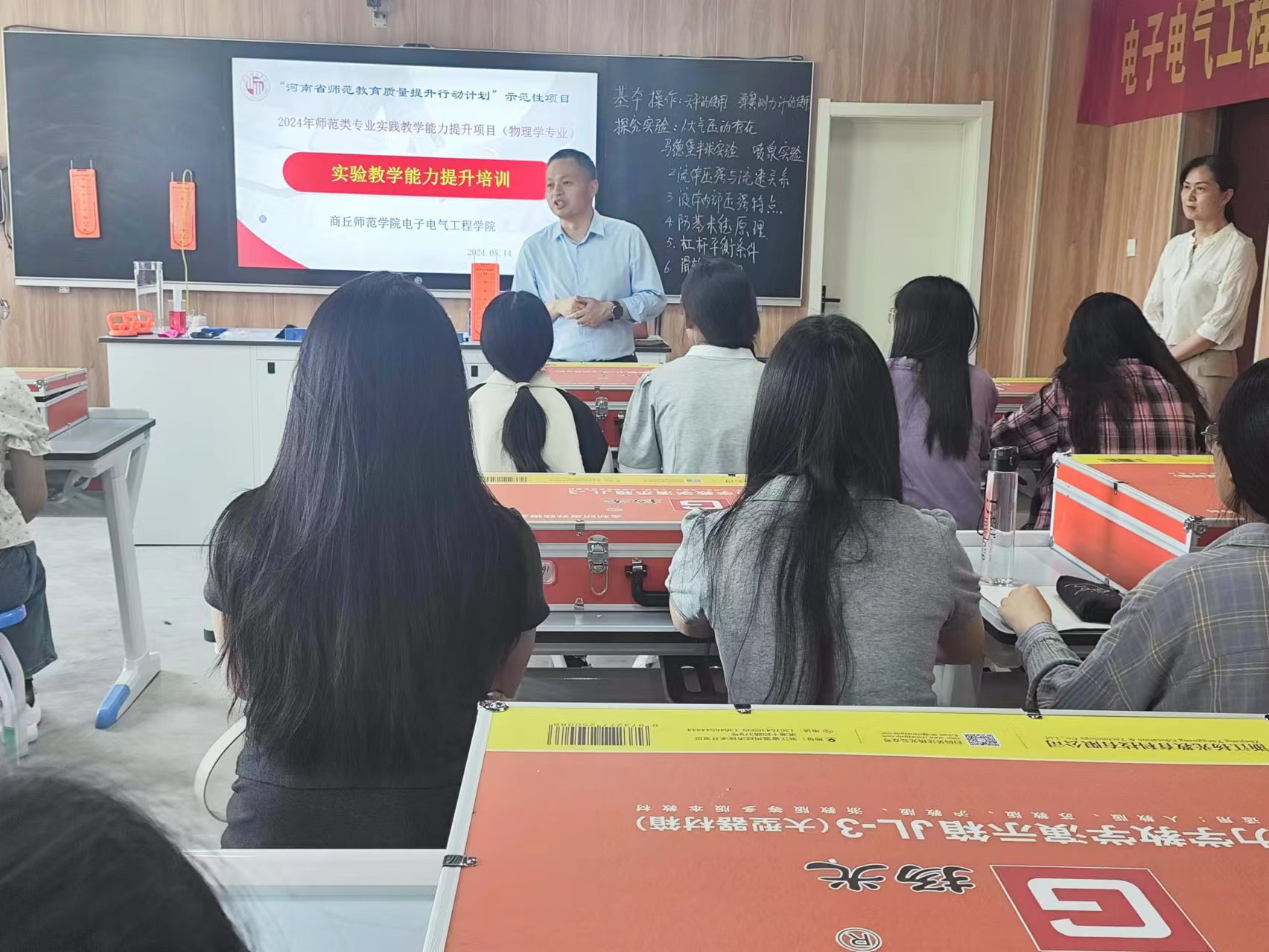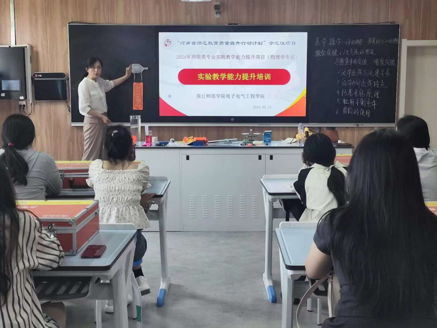 为落实“河南省师范教育质量提升行动计划”的目的和要求,根据师范类专业实践教学能力提升项目的具体进度和安排,伟德国际1949官网于2024年5月14日下午在睢阳校区物理楼407教学能力训练中心开展了中学物理实验教学能力提升培训活动。此次培训活动邀请了商丘市实验中学高级物理教师马晓慧老师负责主要的培训工作,参与的同学来自2022级物理学专业,活动由项目组成员李莉主持。