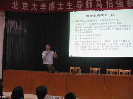 2009年10月9日下午3时,北京大学博士生导师马伯强教授在物理楼报告厅作了一场题目为“从粒子到宇宙—物质世界的探索”的学术报告,我系部分师生聆听了报告。