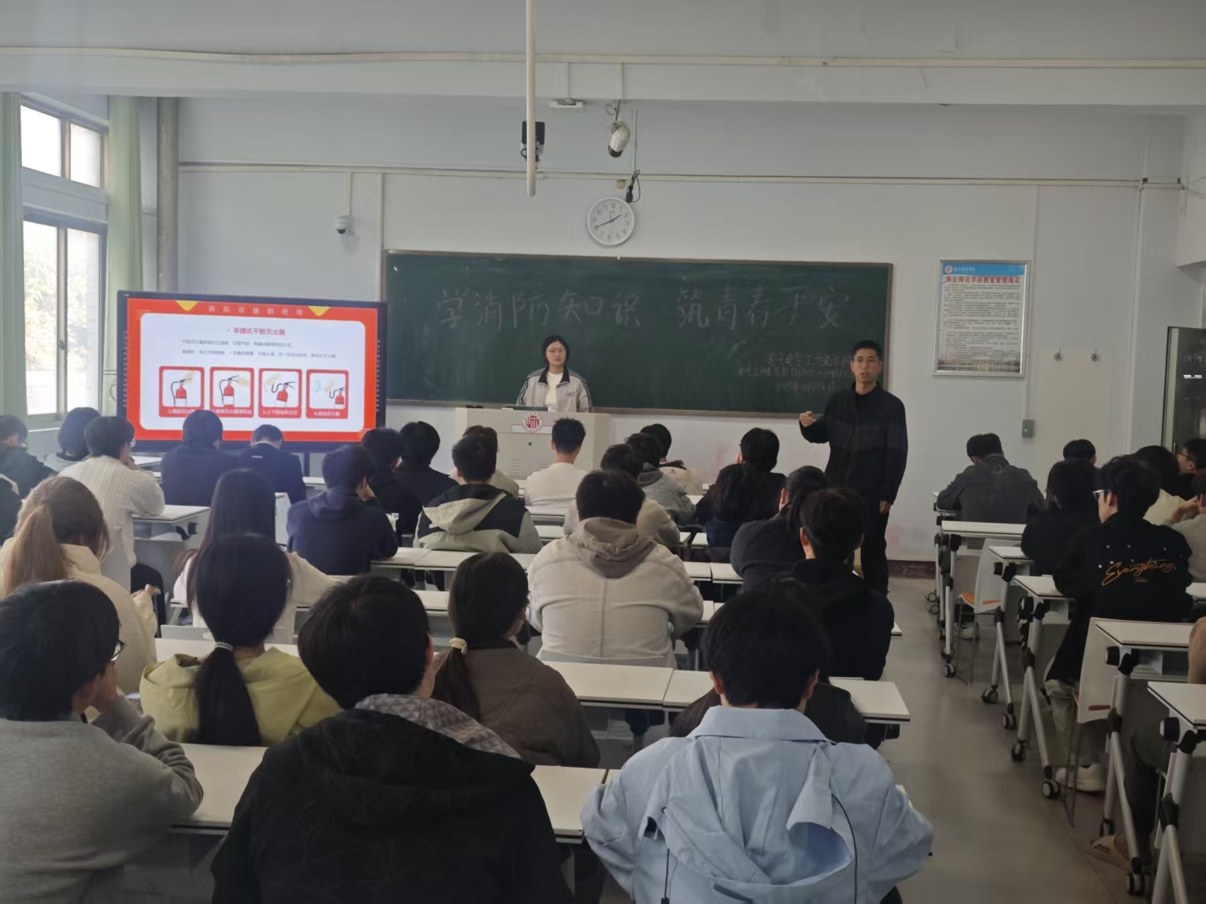 在“学消防知识,筑青春平安”的主题团日活动中,团支书结合校园火灾案例,用通俗易懂的语言讲解火灾成因、扑救办法及疏散逃生技巧等知识,并就宿舍安全用电、实验室消防注意事项等问题进行互动交流,现场学习氛围浓厚。