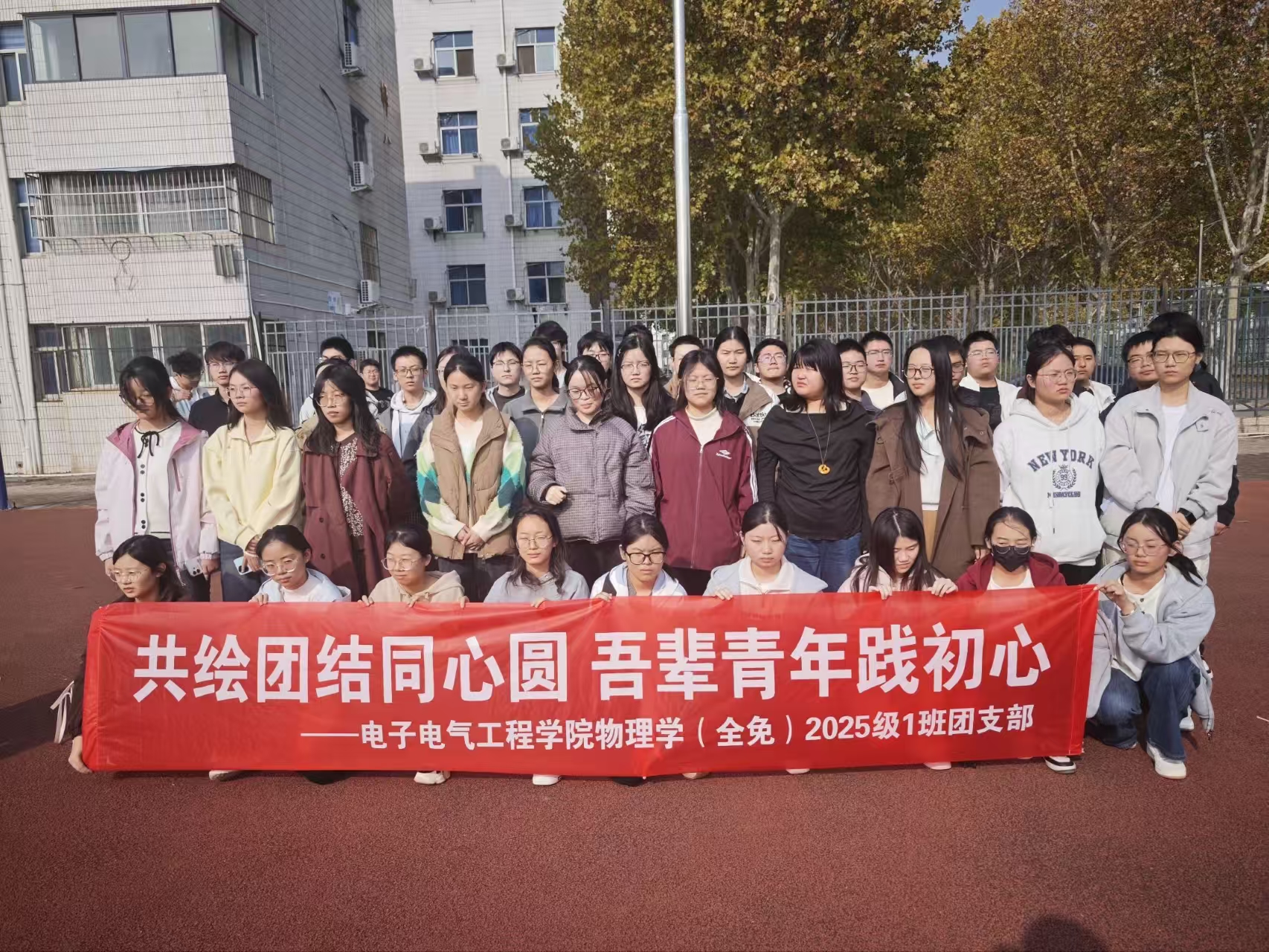 在 “共绘团结同心圆,吾辈青年践初心”主题团日活动中,同学们聚集在操场。通过拔河、两人三足等游戏,让同学们体会团结的重要性,提升团支部的凝聚力和向心力。最后,同学们在宣言横幅上签名,以实际行动践行青年责任与初心。
