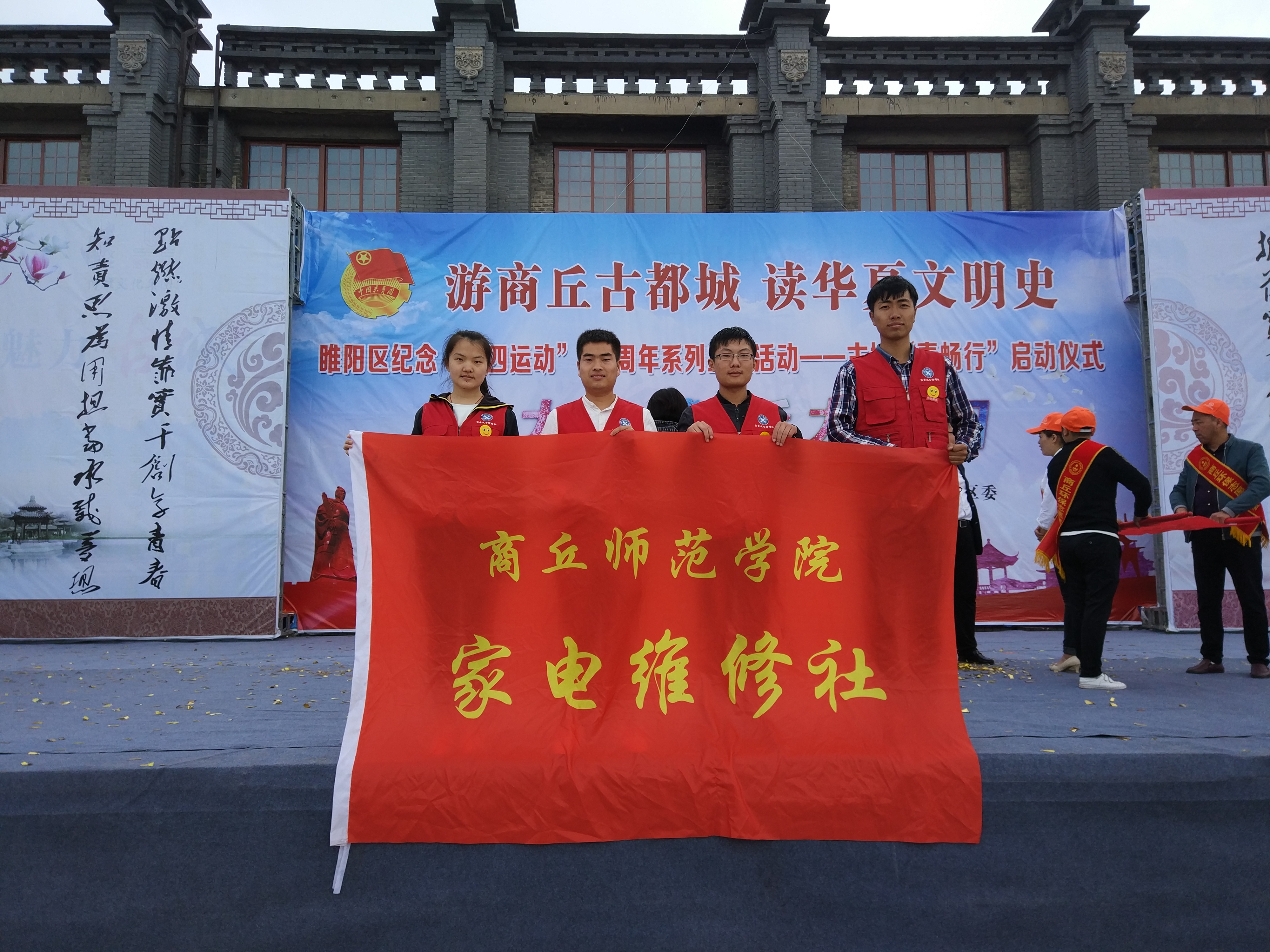 2017年5月4日,伟德国际1949官网的社团---家电义务维修社应邀参加由共青团商丘市委、中共睢阳区委主办,共青团睢阳区委承办的《游商丘古都城读华夏文明史》睢阳区纪念“五四”运动98周年系列主题活动——古城“青畅行”启动仪式,仪式在商丘古城工业遗产园广场举行。