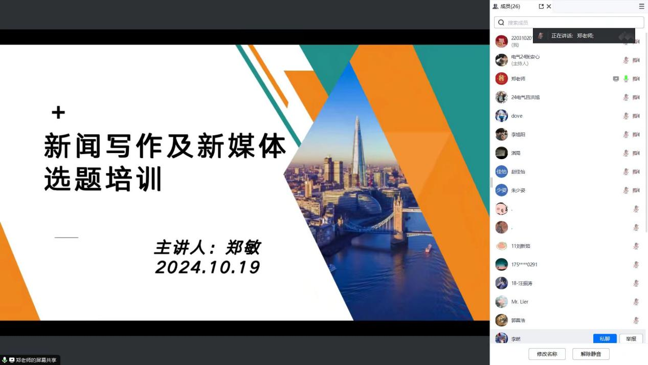 在新闻写作培训环节,郑老师针对最常见的新闻稿件的撰写做了详细讲解,其中包括了对格式的要求,对内容的概括以及对重要语句的提炼和侧重表述等。她还结合自己多年的学习经验,示范了如何撰写出具有吸引力和感染力的新闻稿件的实用技巧。