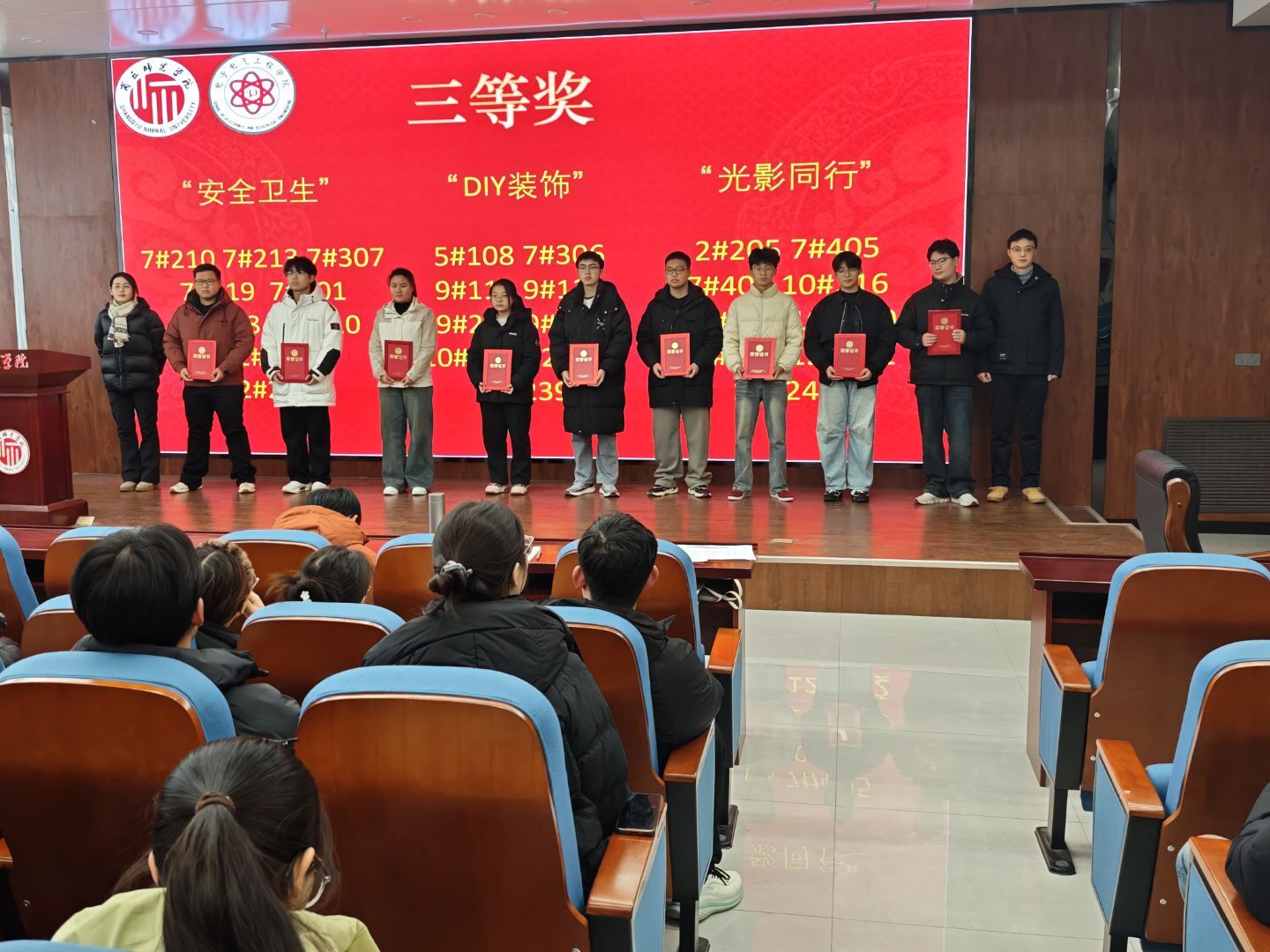 大会伊始,孙莉娟宣读《伟德国际1949官网关于表彰“宿说青春,雅室明志”第八届老员工宿舍文化节获奖宿舍的决定》。随后,出席领导老师依次为获奖宿舍代表颁奖。本次活动共评选出一等奖宿舍9个、二等奖宿舍16个、三等奖宿舍28个。