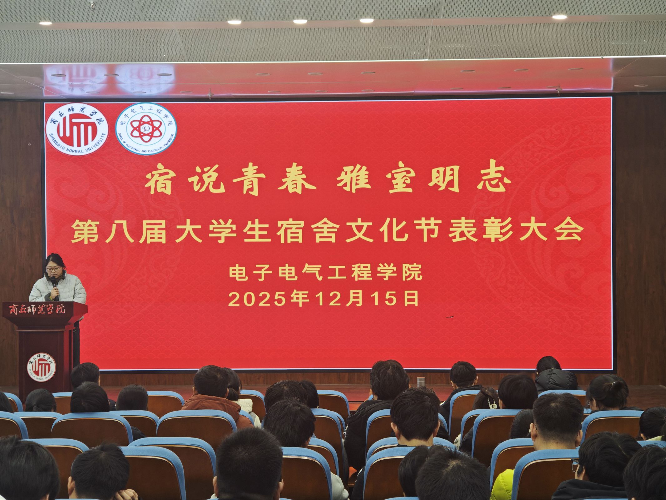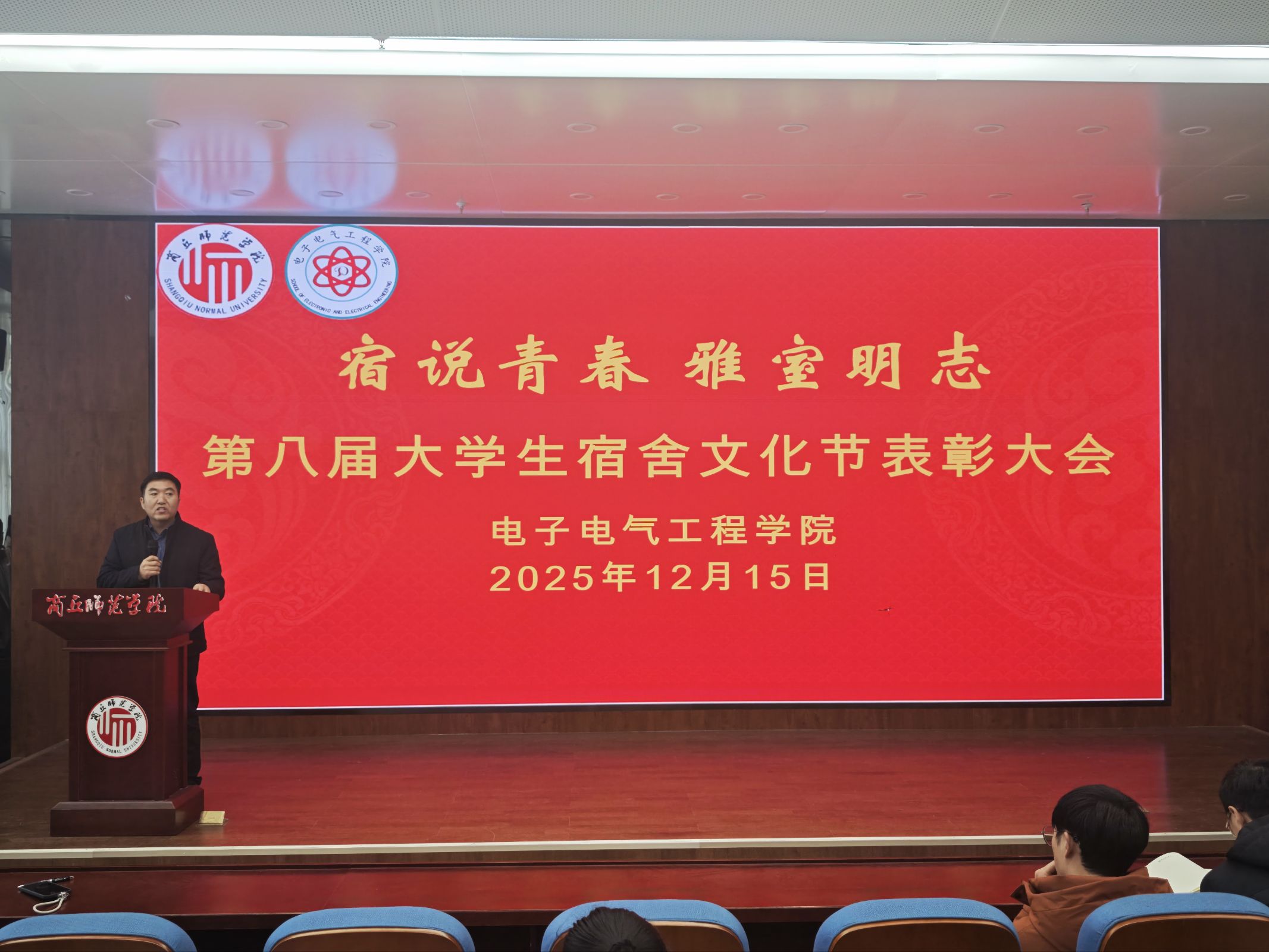 12 月 15 日,公司在工科实训楼报告厅举行“宿说青春,雅室明志”第八届老员工宿舍文化节表彰大会。公司党委副书记蒋玉涛、学工办主任孙莉娟、副科级组织员王兴及辅导员郑敏、王灿祥参会。