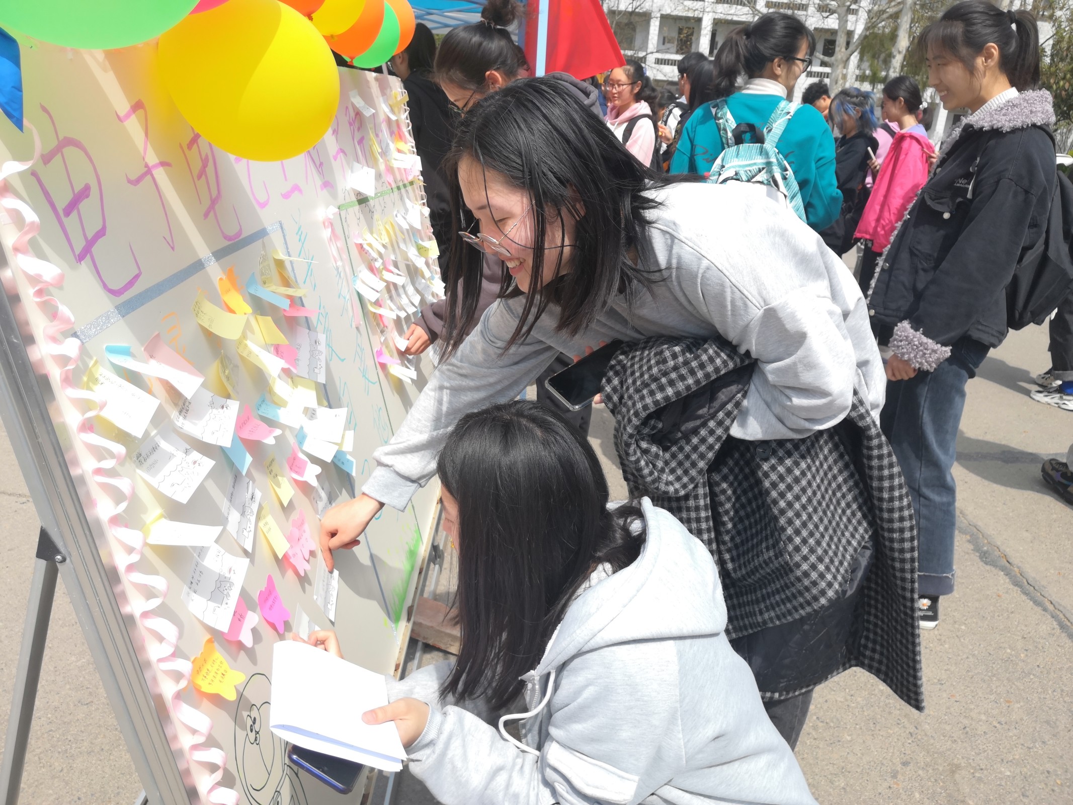 此次活动以三种形式展开,分别为心灵寄语、征集疫情温馨故事、告白父母。既可以通过表白展板表露心声,倡导老员工关爱自己,感谢自己;还可以与大家分享在疫情期间发生的令人难以忘怀的动人故事,引导同学们树立阳光积极心态,感恩生命;还可以告白父母,感谢父母多年来的养育,感恩父母。活动开始后,同学们争先恐后地来到活动地点,在横幅上签字并将便签贴在展板上,留下自己的印记,活动进行到最后,表白展板上满满的都是同学们的心里话。
