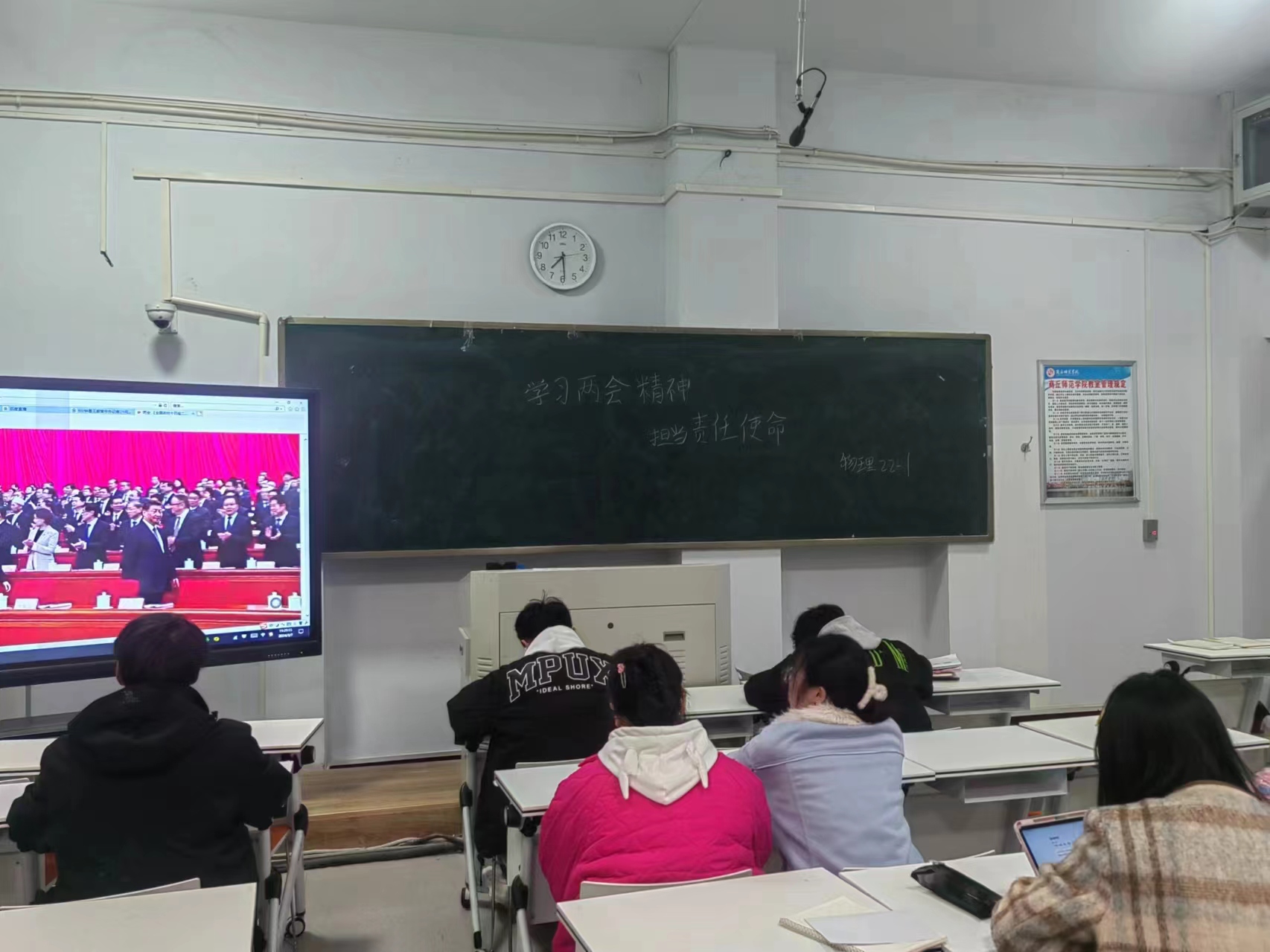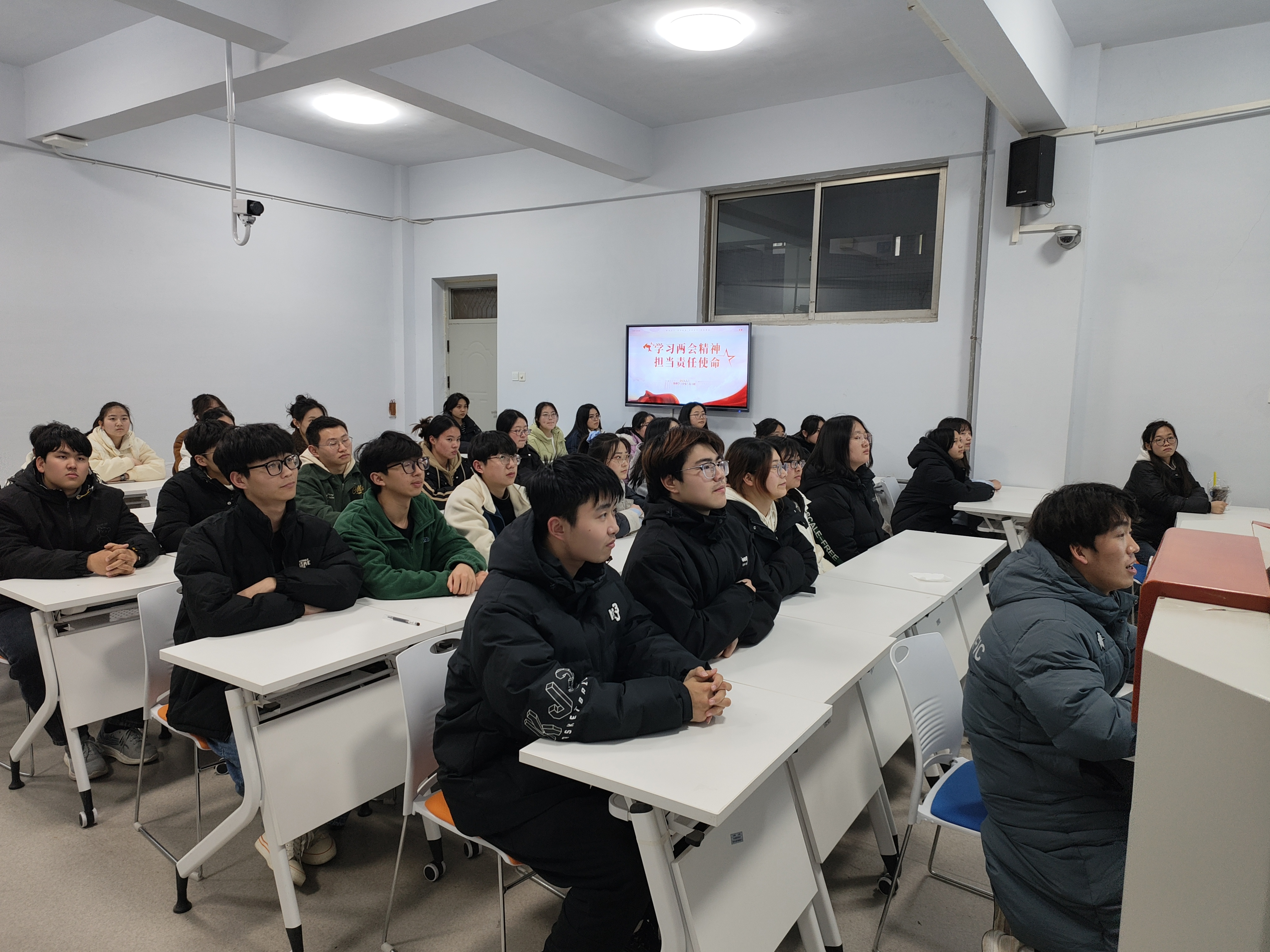 会上,各班级通过视频直播等多种形式深入学习两会精神,热议政府工作报告。“2023中国发展成绩单”用数字说话,展示了我国取得的令人瞩目的成绩。“人工智能+”“新质生产力”“量子技术”等这些新词、热词,描绘了发展新蓝图,令人倍感振奋、充满信心。同学们认真聆听,深入思考,对于国家的未来发展、政策走向有了更加清晰的认识。
