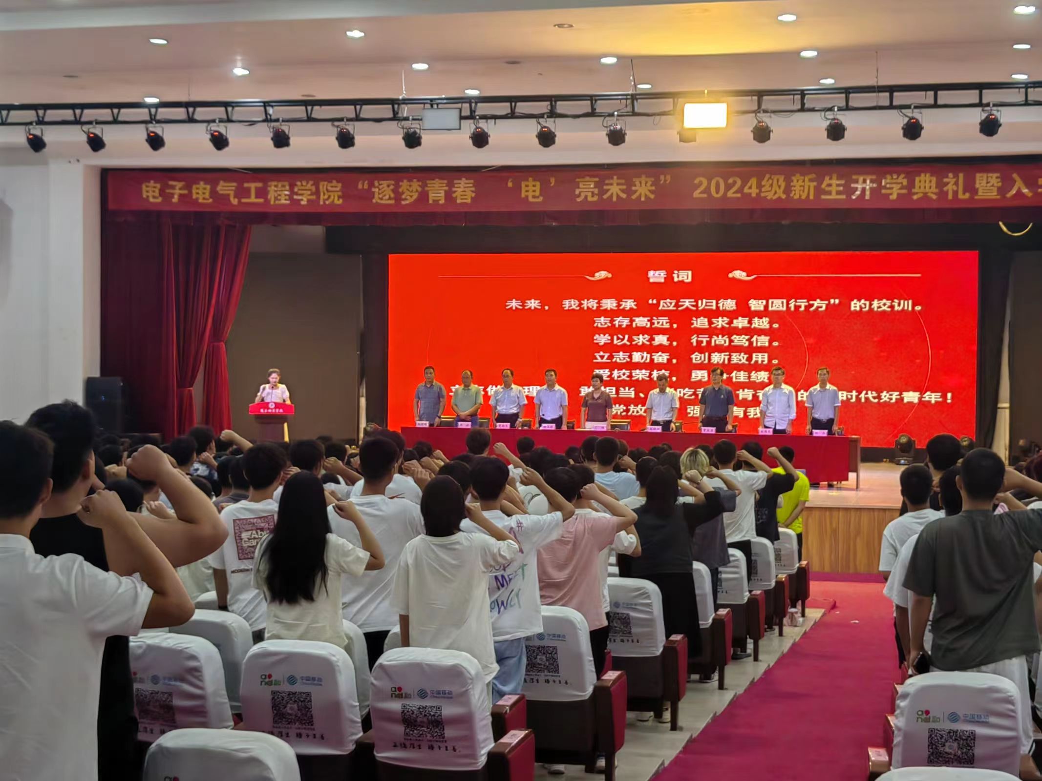 教师代表、优秀员工李波老师结合自己的求学和成长之路,分享了自己的心路历程,激励同学们在事上磨炼,在学中砥砺。老生代表自动化22-1班王坛熔同学分享了自己两年来的蜕变过程,鼓励2024级新同学勇敢追梦,珍惜韶华,不负期待。电气24-1汪璇同学代表新生表达了成为“电院人”的喜悦与激动之情,期待在未来的大学时光里,积累扎实学识、勇攀科学高峰,在砥砺奋进中为强国建设贡献青春力量,并带领2024级全体同学进行青春宣誓。