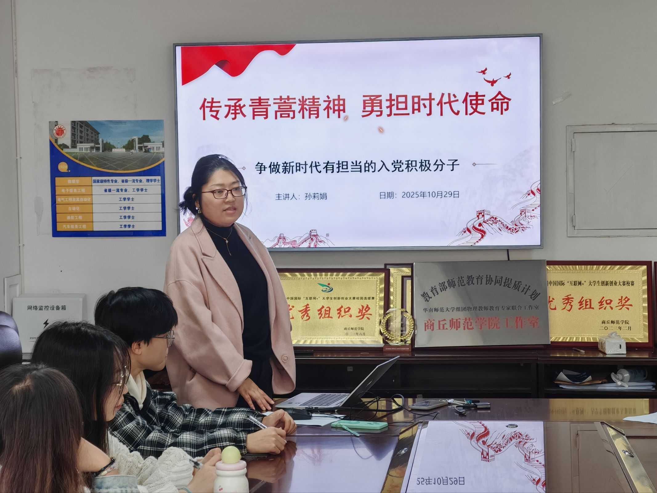课上,孙莉娟以屠呦呦院士及青蒿素研制历程为例,阐释中国共产党员的责任使命,强调入党积极分子应在思想行动上发挥模范带头作用,号召理工科员工以其爱国、创新、奉献等精神为典范,投身国家科技事业。接着,她从新时代青年的时代担当讲起,鼓励青年学子要锚定坐标。最后,孙莉娟从四方面明确青年担当:扎实专业学习是服务国家的前提,坚守深耕是重要担当,通过义务维修、支教等实践将知识落地是奉献之道。