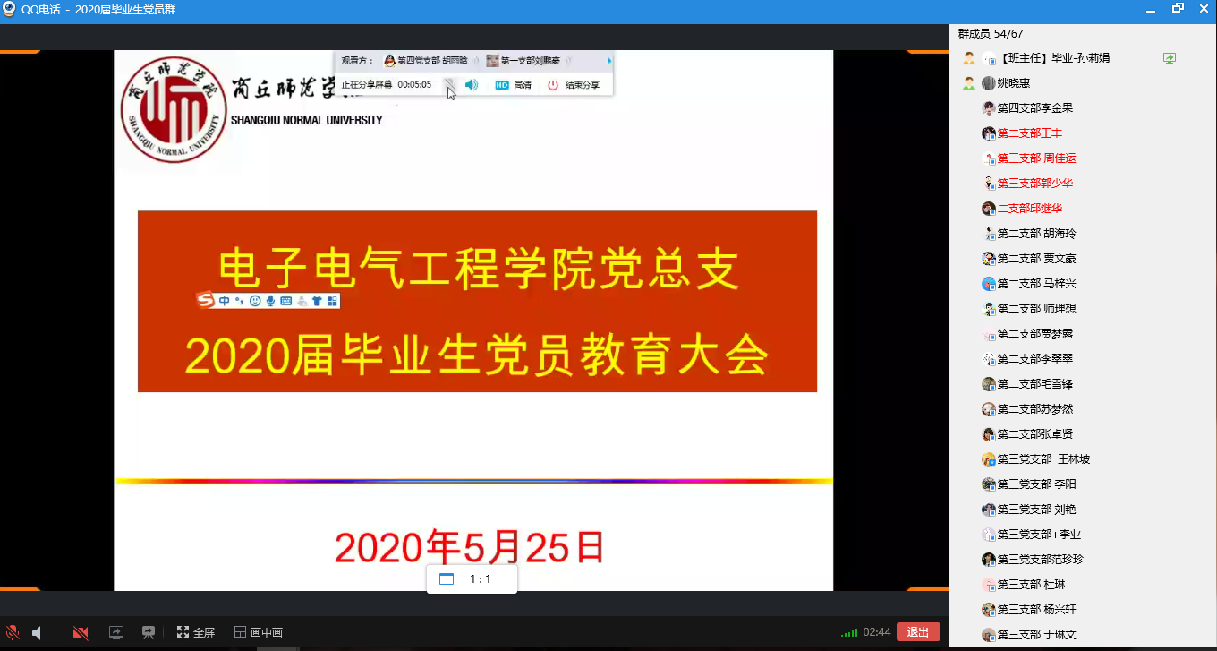 为加强对毕业生党员的教育,做好毕业生党员组织关系、组织档案转移工作,5月25日,公司党总支通过网络形式召开2020届毕业生党员大会。参加会议的有党总支书记姚晓惠,16级辅导员孙莉娟及全体毕业生党员。