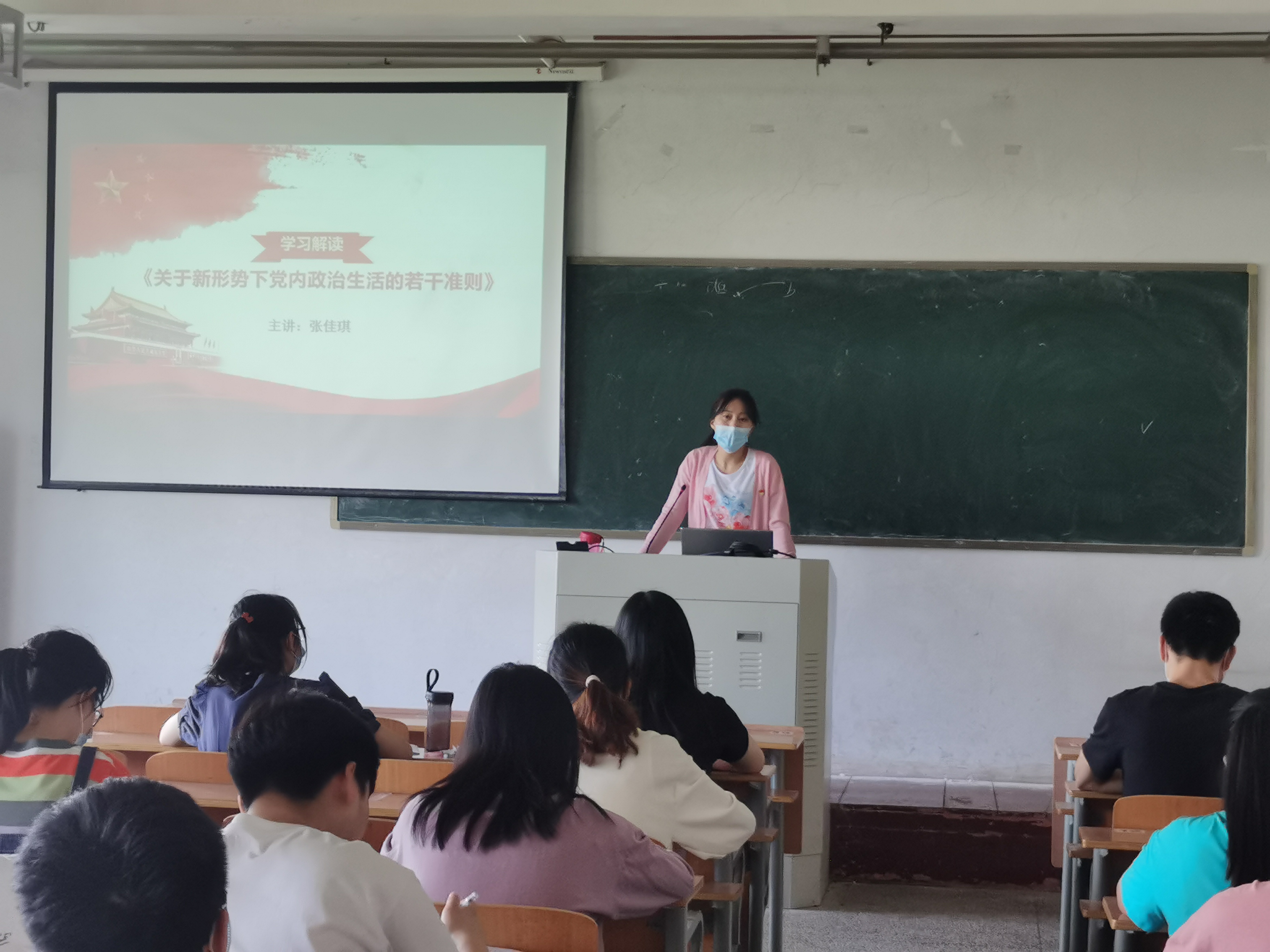 5月20日,伟德国际1949官网于睢阳校区开展学习《关于新形势下党内政治生活的若干准则》专题党课活动,会议由员工第一党支部书记张佳琪主讲,全体预备党员参加。