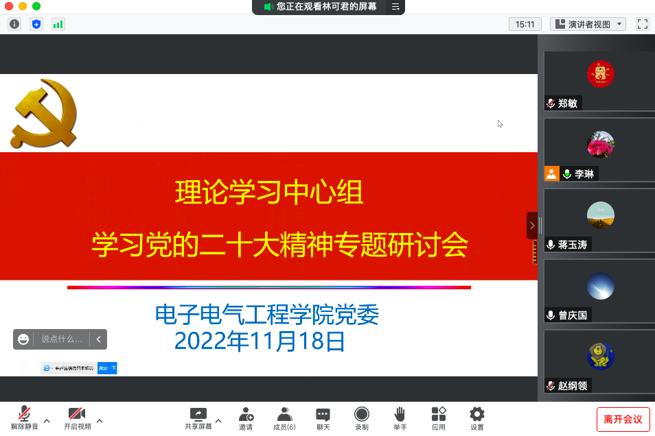 11月18日,公司党委理论学习中心组于线上召开专题研讨会,本次学习研讨的主题是学习宣传贯彻党的二十大精神,会议由公司党委书记李琳主持,理论学习中心组全体成员参加。