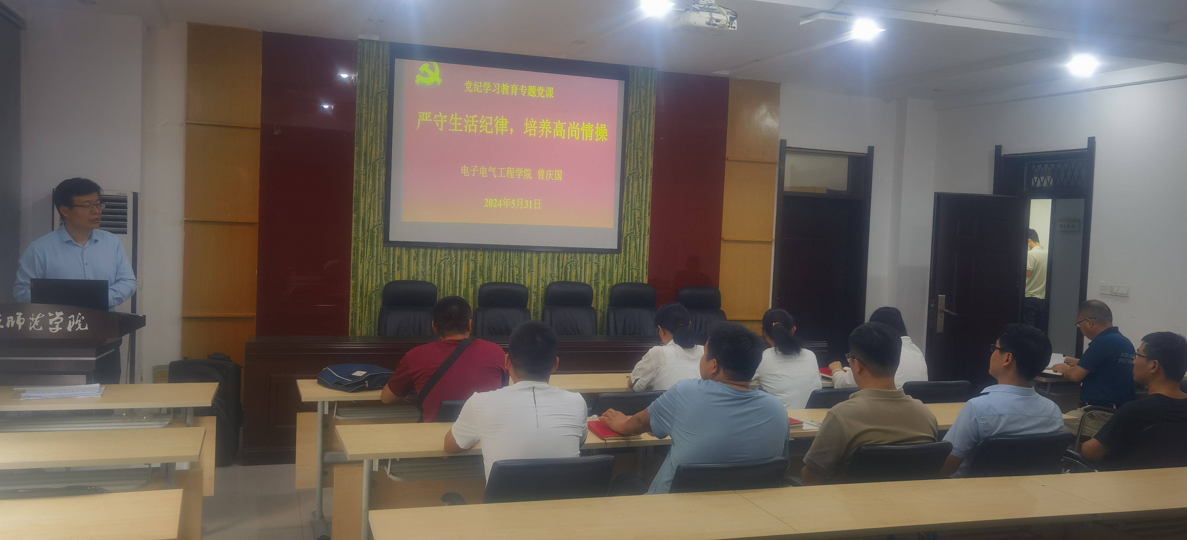 5月31日,伟德国际1949官网副经理曾庆国在物理楼208会议室为教师第一党支部全体党员上《中国共产党纪律处分条例》专题党课,党课的主题为“严守生活纪律,培养高尚情操”。