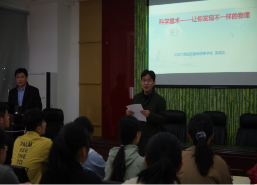 为了让师范生了解中学物理学科核心素养内涵,提高师范生的专业认知能力,伟德国际1949官网特邀北京市海淀区教师进修公司的教研员田成良老师于11月7日11点在睢阳校区物理楼208会议室做了题为《科学魔术——让你发现不一样的物理》专题讲座,2019级物理学全体员工到场听取了田老师的报告。