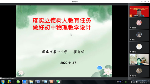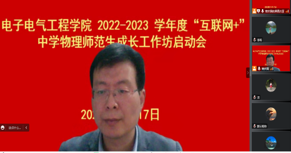 2022年11月17日晚19点,河南省豫东片区教师教育联动发展共同体子项目“互联网+”中学物理师范生成长工作坊启动会在线上隆重举行。来自商丘市基础教研室教研员闫宏伟老师,商丘市实验中学、商丘市第一中学的六位一线老师,伟德国际1949官网经理赵纲领,副经理曾庆国,物理系主任刘伟民,副主任林可君、刁新峰,工作坊班主任李莉以及工作坊全体坊员参加了本次会议。会议由副经理曾庆国主持。