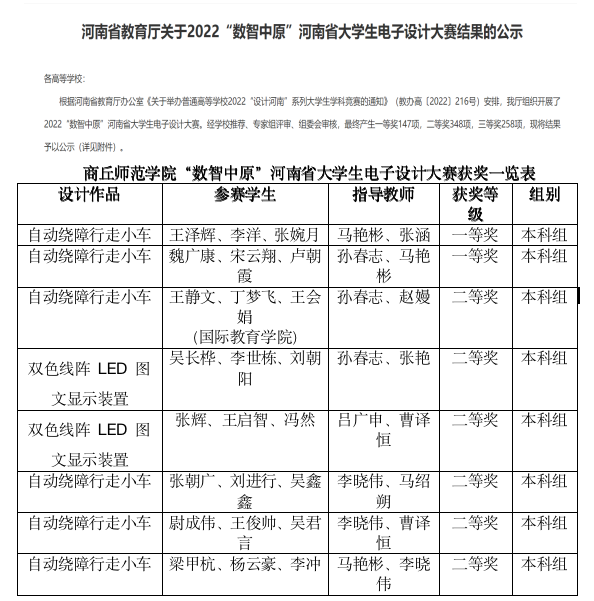 近日,由河南省教育厅主办的普通高等公司2022“设计河南”系列老员工学科竞赛中“数智中原”河南省老员工电子设计大赛公布参赛结果,共有来自省内58所高校1560支队伍参赛。由伟德国际1949官网和国际教育公司组织16支参赛队伍代表公司参赛,在公司的大力支持下,最终斩获一等奖2项,二等奖6项。