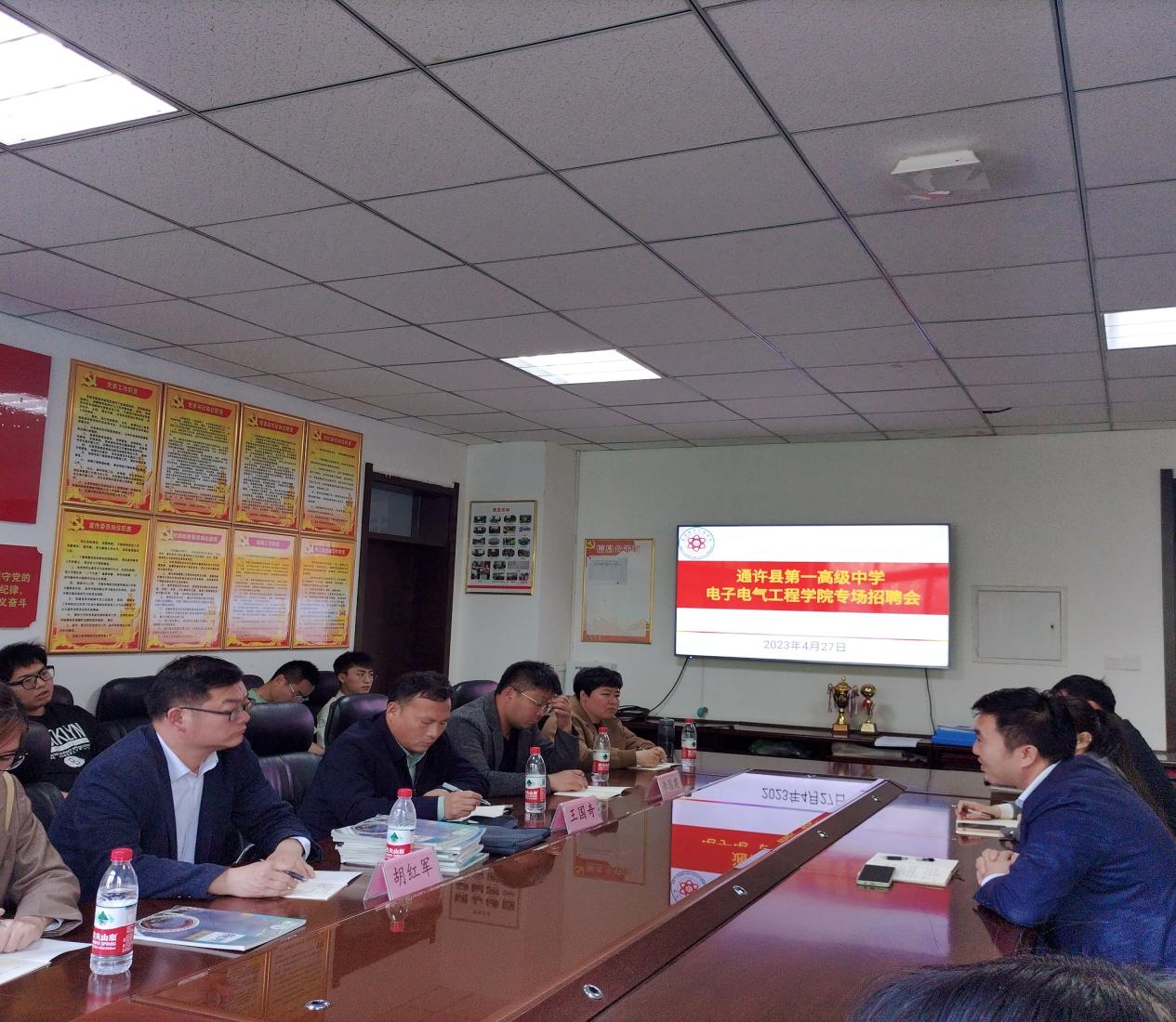 4月27日,公司于物理楼206室举办通许县第一高级中学专场招聘会。通许县第一高级中学董事长王国奇、副董事长李国建、政教主任胡红军,公司党委副书记蒋玉涛、团委副书记兼2019级辅导员张佳琪出席会议,2019级物理学全体员工参会。