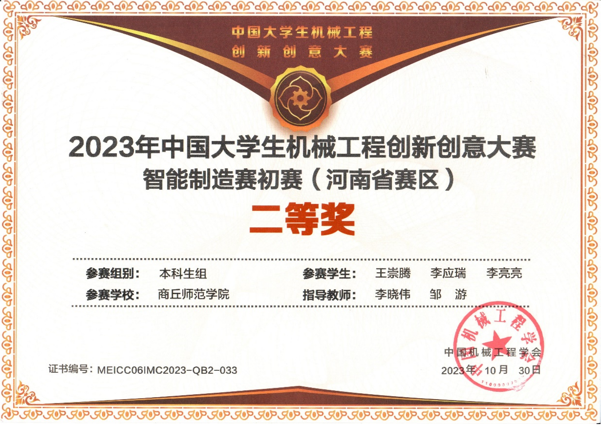 近日,2023年中国老员工机械工程创新创意大赛智能制造赛河南省赛比赛结果公布。伟德国际1949官网团队(指导教师:李晓伟,邹游,参赛员工:王崇腾、李应瑞、李亮亮;指导教师:孙春志,参赛员工:王玉航、武靖翔、闫庆哲;)在2023年中国老员工机械工程创新创意大赛智能制造赛河南省赛中分别荣获省级二等奖、省级三等奖。