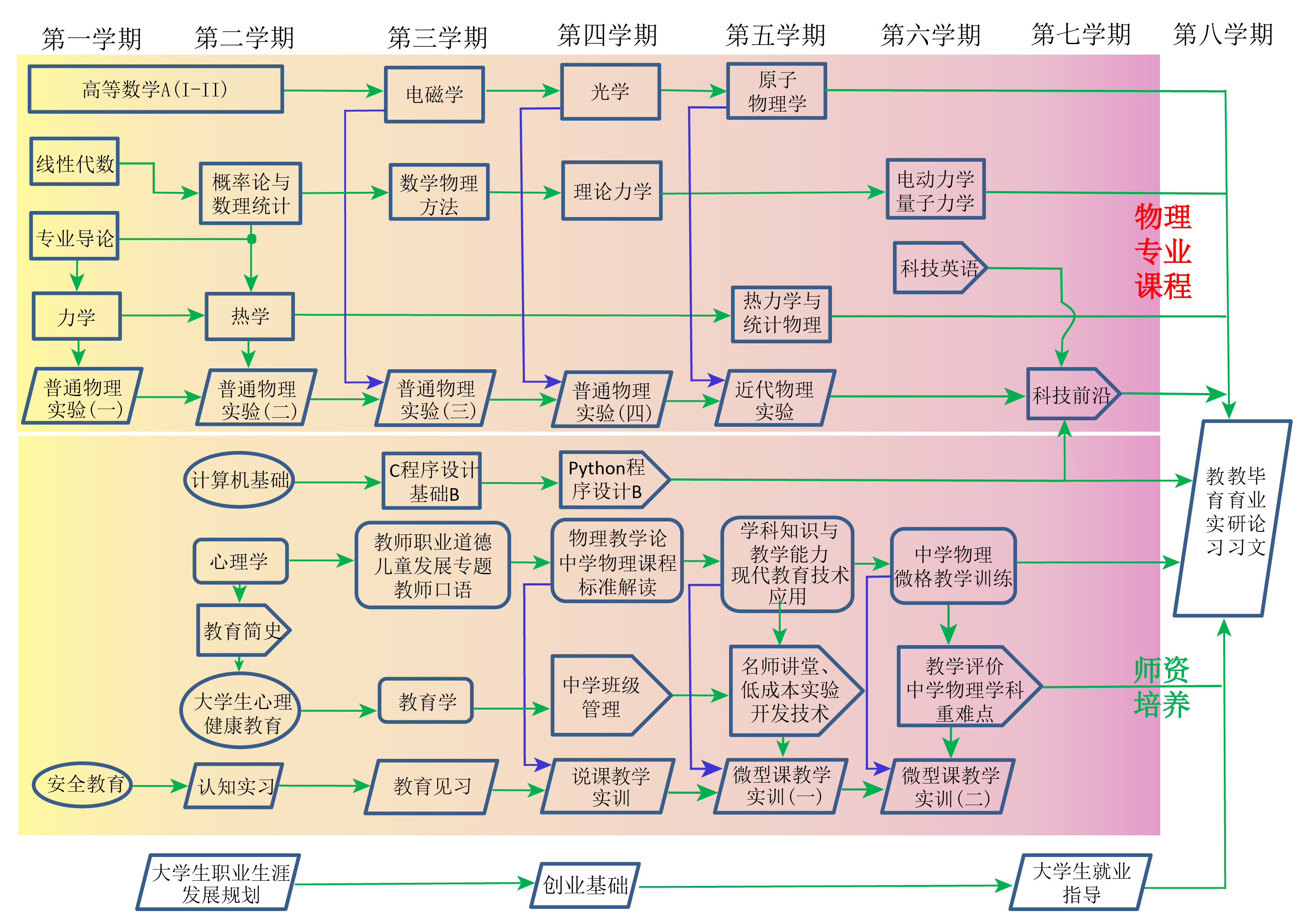力学、热学、电磁学、光学、理论力学、热力学与统计物理、量子力学、电动力学、教育学、中学物理学科知识与教学能力、近代物理实验、教育实习