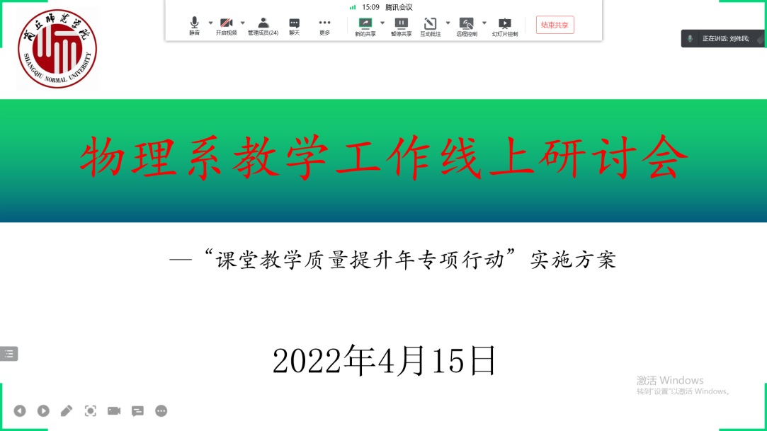 为深入领会公司“课堂教学质量提升年专项行动”实施目的和方案,不断提升教学水平,4月15日,物理系举行学习《“课堂教学质量提升年专项行动”实施方案》线上研讨会。会议由物理系主任刘伟民主持,物理系全体教师参加。
