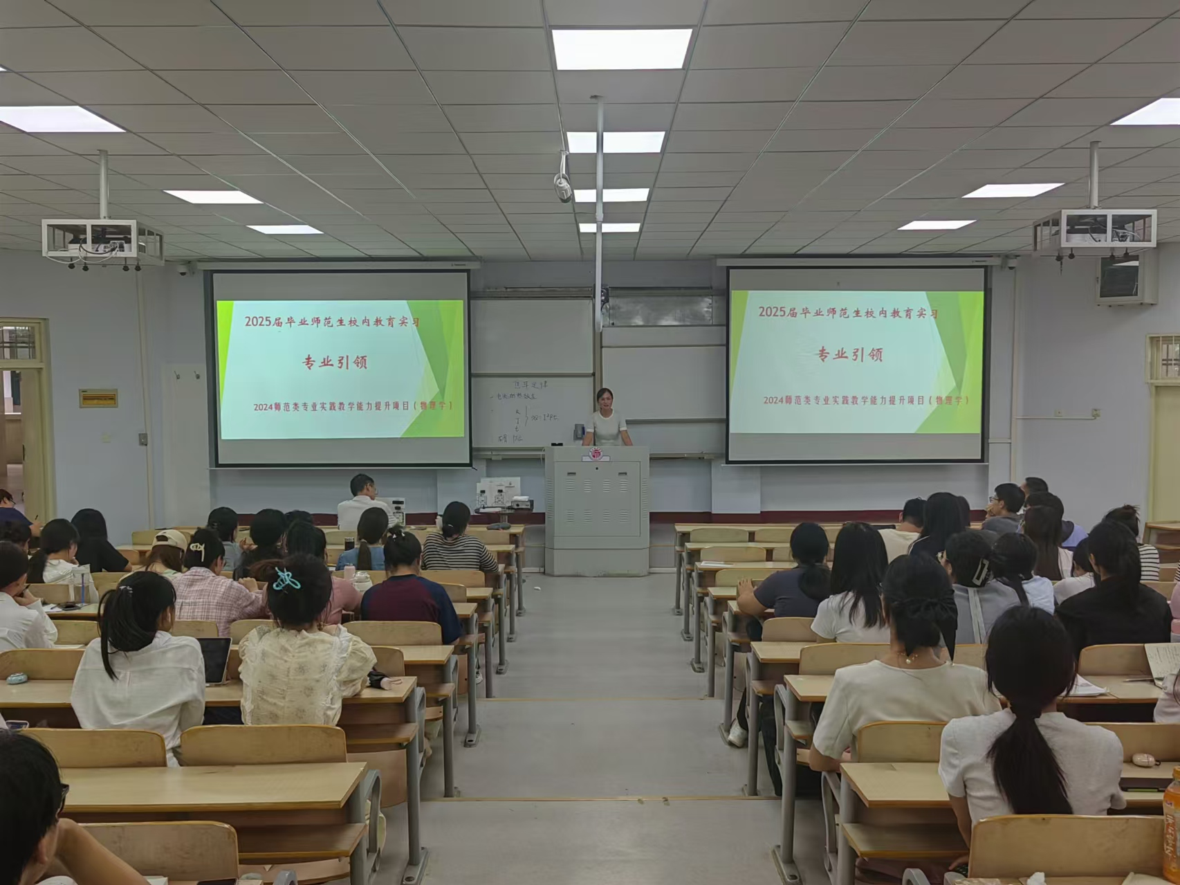 9月10日,在睢阳校区1号教学楼106教室,公司邀请商丘市实验中学两位一线优秀教师:高扬和马晓慧,分别为员工带来一堂公开课和教学技能专业讲座,曾庆国副经理、校内指导教师和21级参加校内教育实习的物理学专业全体员工参加。
