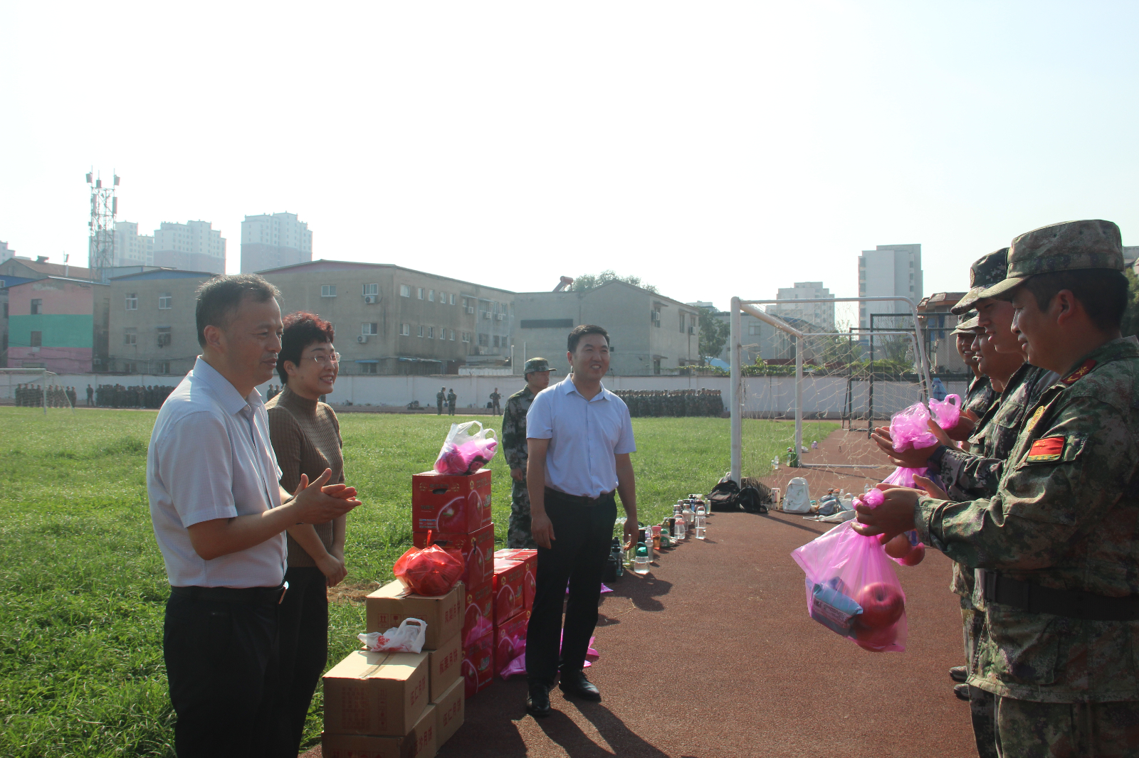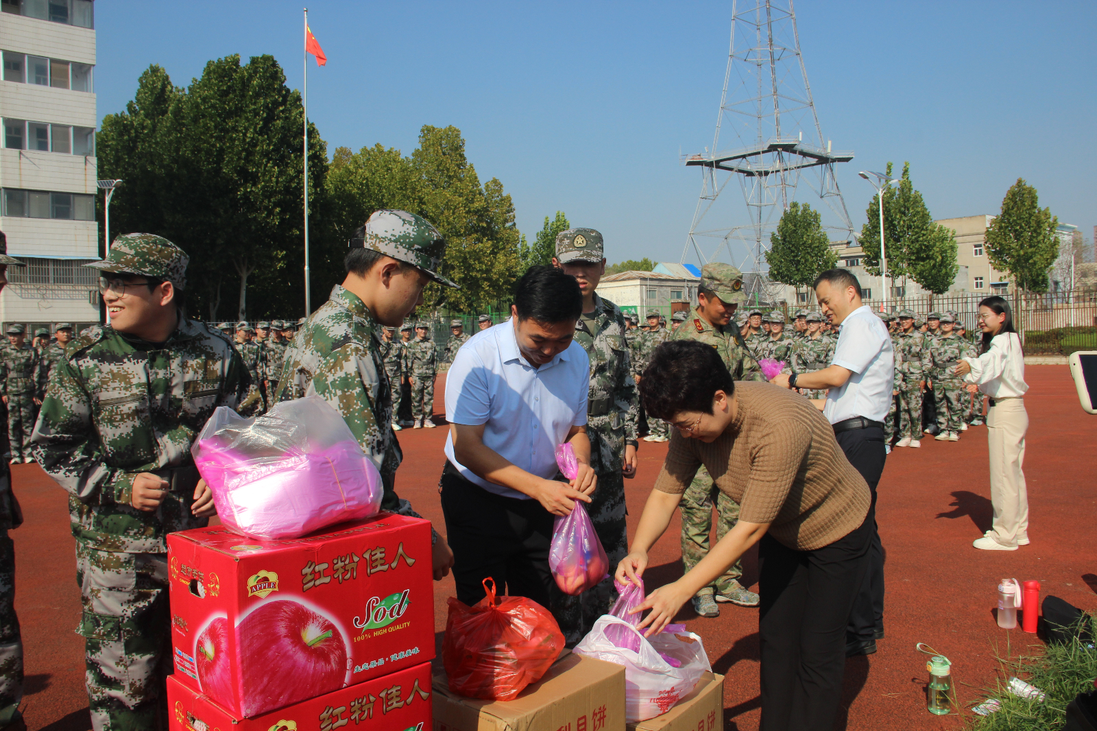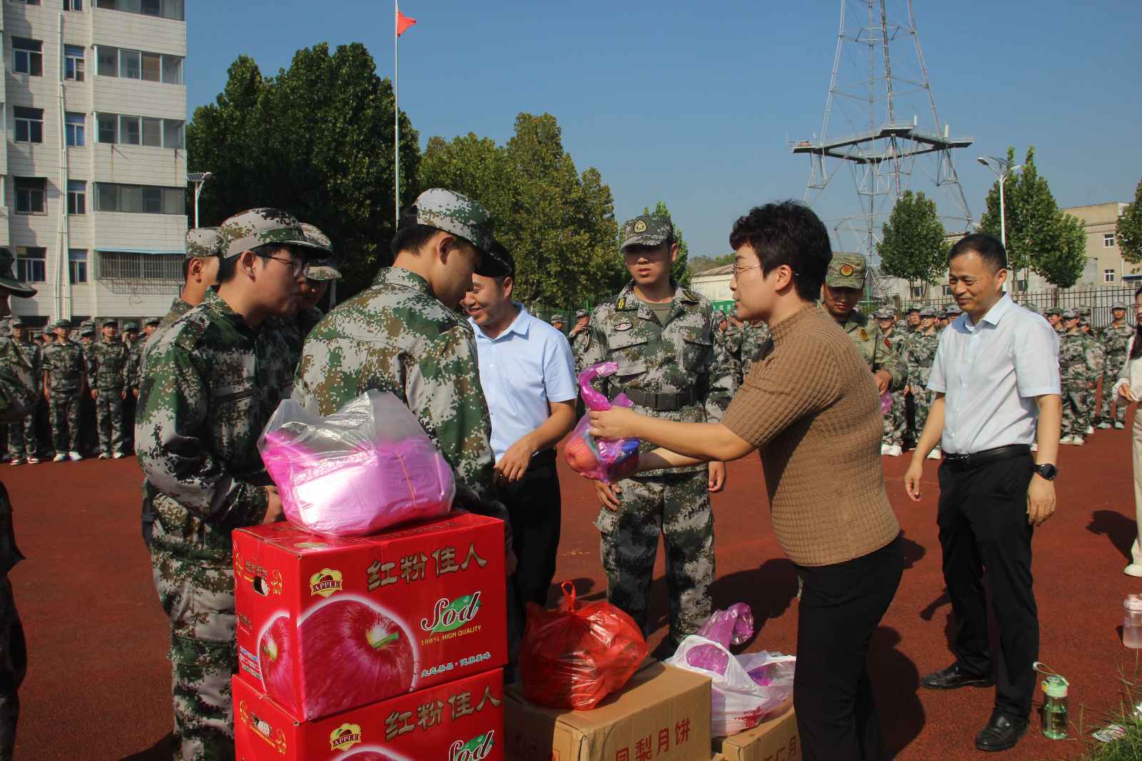 在军训现场,李琳首先对2024级新生的刻苦训练和昂扬向上的精神给予高度的赞扬,并对教官们的辛苦付出表示感谢。鼓励同学们圆满完成军训任务,练就过硬本领铸就坚强意志,并叮嘱全体新生厚植家国情怀和“强国有我”的坚定信念,涵养进取品格,在训练中奋勇拼搏、战胜自我,在商师这方成才沃土,浇灌理想之花持久盛放。最后,公司领导为军训教官和全体2024级新生送上中秋月饼和水果,并向他们致以最诚挚的节日问候。